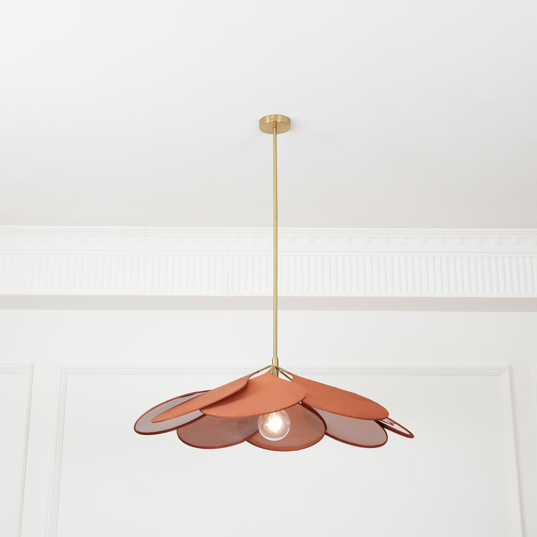 The unexpected combination of metal, and fabric in a floral and airy suspension. To the sleekness of a teardrop-shaped petal, the designer adds an homage to the retro ceiling fans of louvered bedrooms. This petal pendant plays subtly with light, diffusing a soft clarity in the room and delicate shadows on the ceiling.