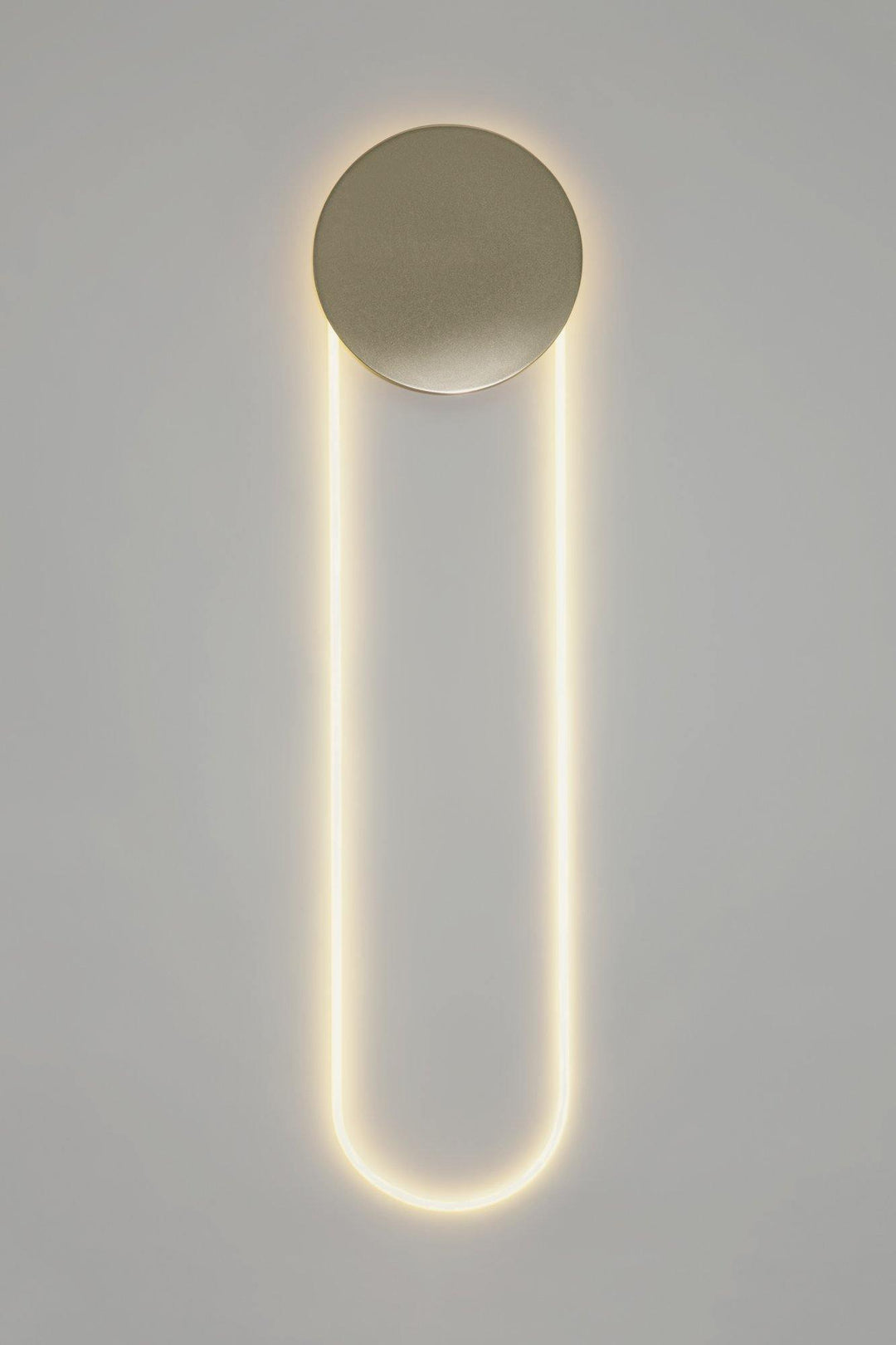 RA Wall participates in its surroundings by playing with contrasts, shadows and reflections. The circular neon tube emits a bright light that reflects softly on the wall. A solid bronze disc eclipses a part of the light and draws in the hues of the setting.