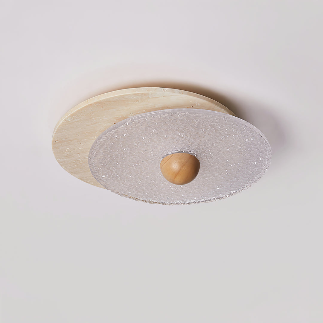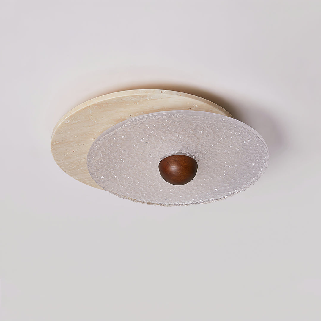 The Radiant Disc Ceiling Lamp by Vakkerlight merges textured glass and travertine for a timeless design. Its glowing centerpiece radiates warmth, adding depth and elegance to both contemporary and rustic spaces.