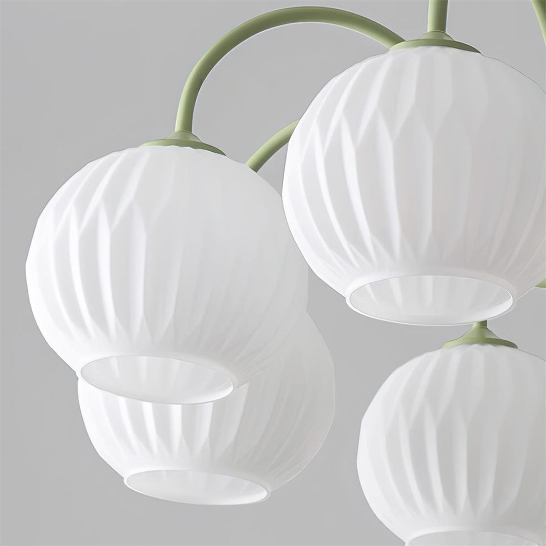 Elevate your space with the Renee Chandelier, a symphony of light that embodies modern elegance. The delicate curves and soothing green hues create a serene ambiance, while ribbed shades enhance the warm, inviting glow. With its graceful stems and circular ceiling mount, this fixture is not just a light source, but a work of art.