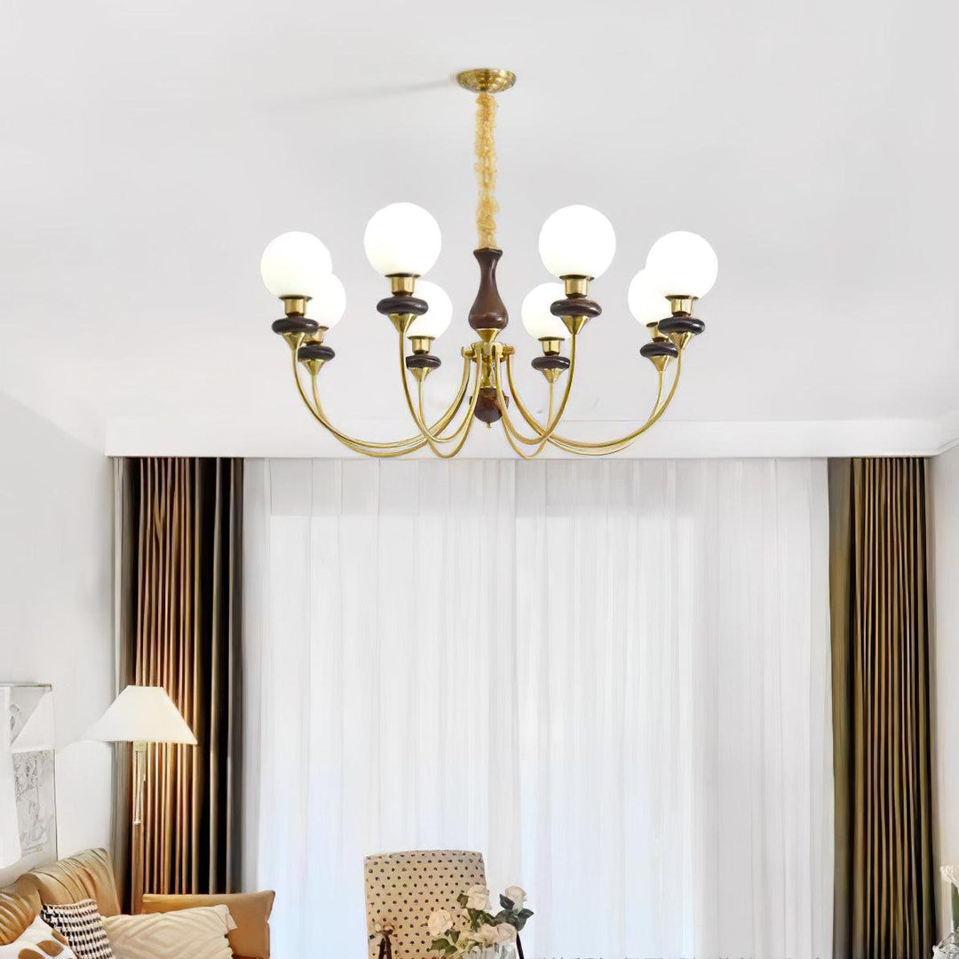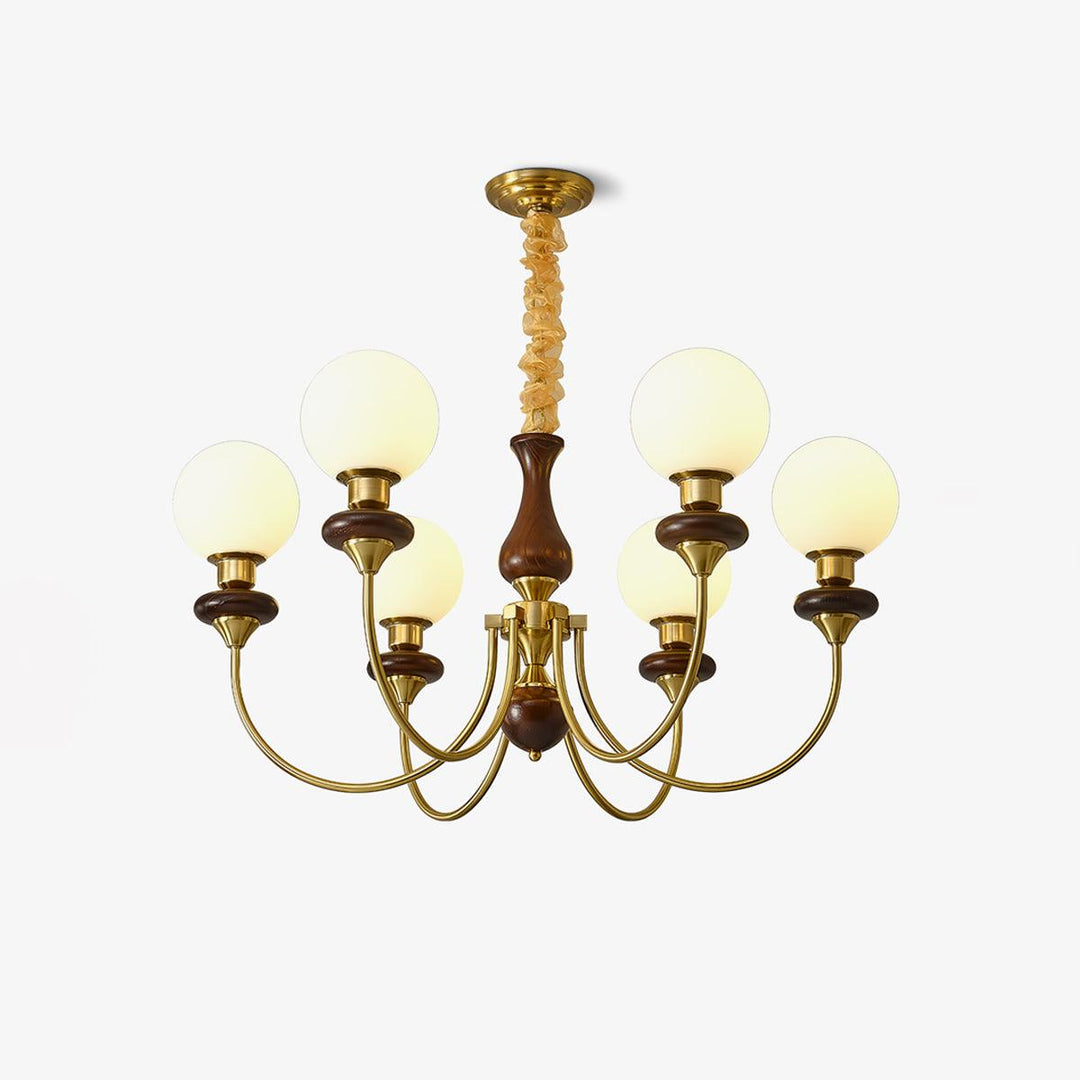 This Retro Monique Chandelier is inspired by classic American and Medieval styles. It is crafted of solid brass and walnut for long-lasting durability and a timeless aesthetic. It is the perfect lighting solution to evoke sophistication in any space.