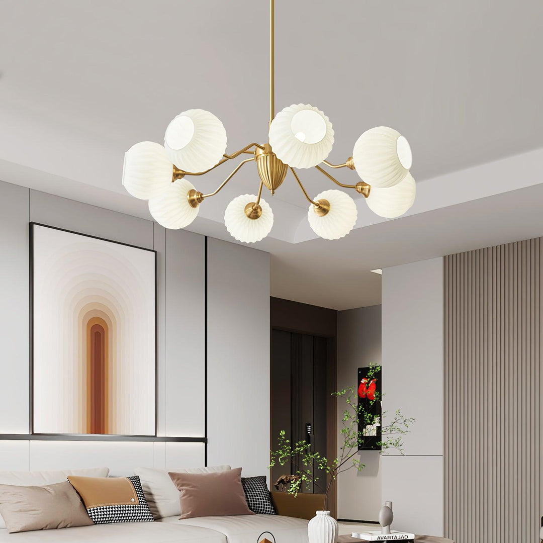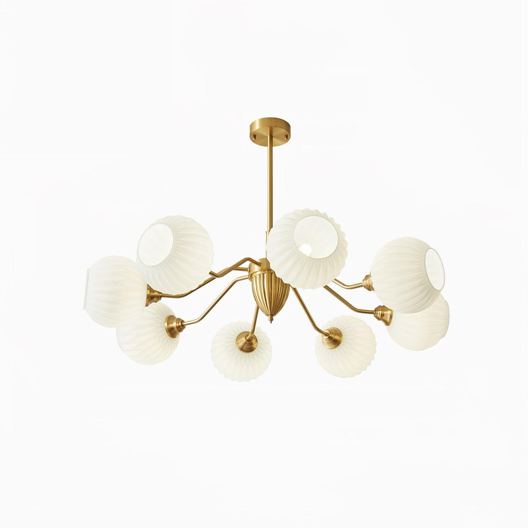 This Ribbed Glass Ball Chandelier offers a timeless aesthetic with its uniquely ribbed glass lampshade in creamy white and golden hues. The warm and inviting ambiance it creates adds sophistication to any room, while the luxurious and delicate appeal evokes a sense of elegance.