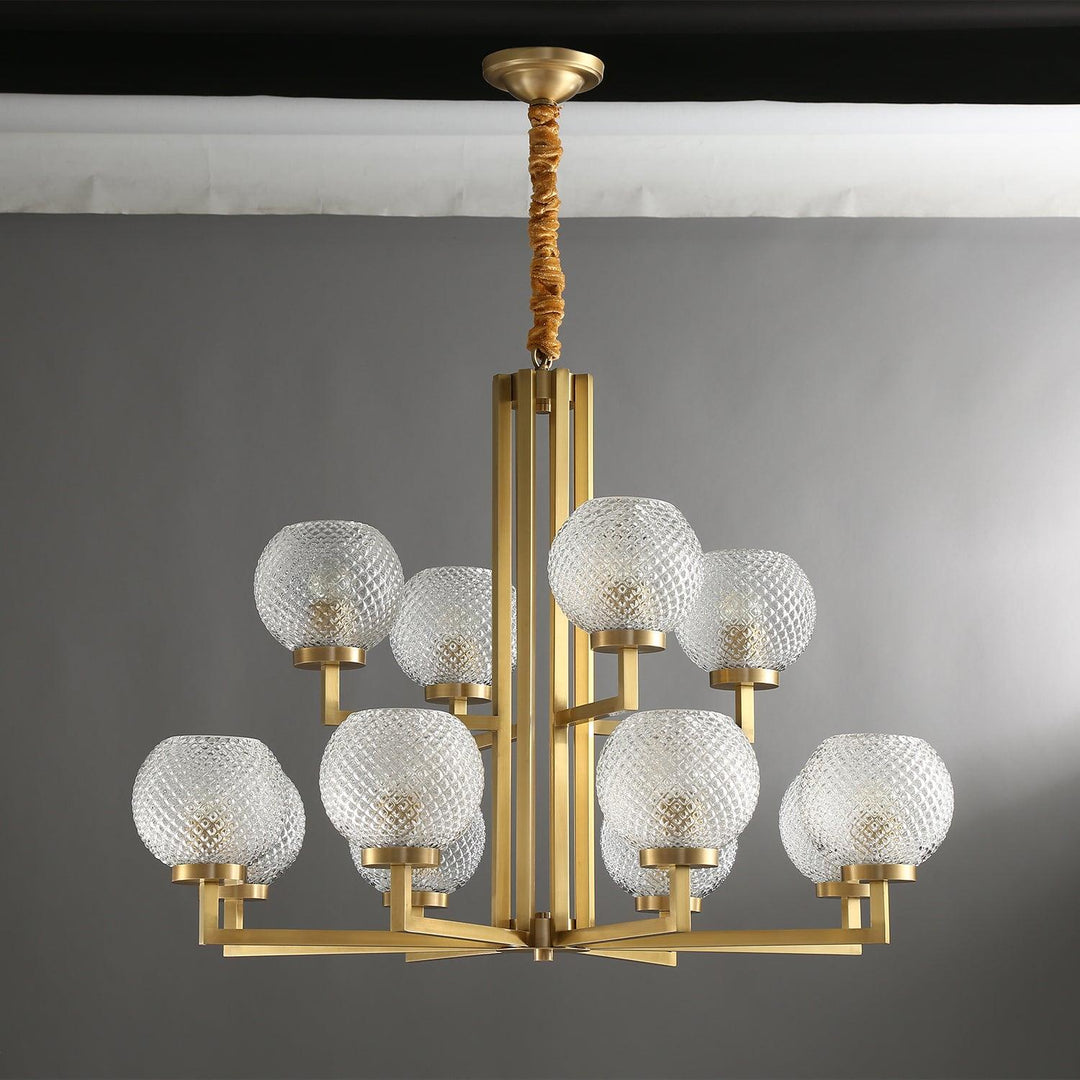 “Luxurious and stunning, the modern Helios chandelier is characterized by its perfectly angled, With bulbs neatly housed in aged brass, ribbed glass orb shades for an added touch of whimsy. The overall composition is futuristic and leans mid-century modern in its styling. This striking luminary comes together harmoniously in its eye-catching geometry and luxury appeal.