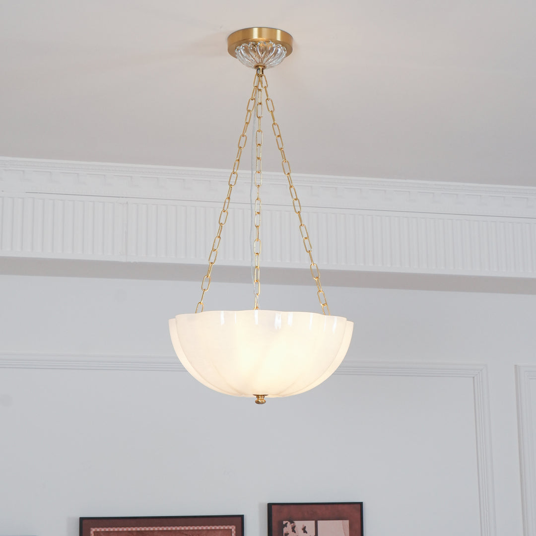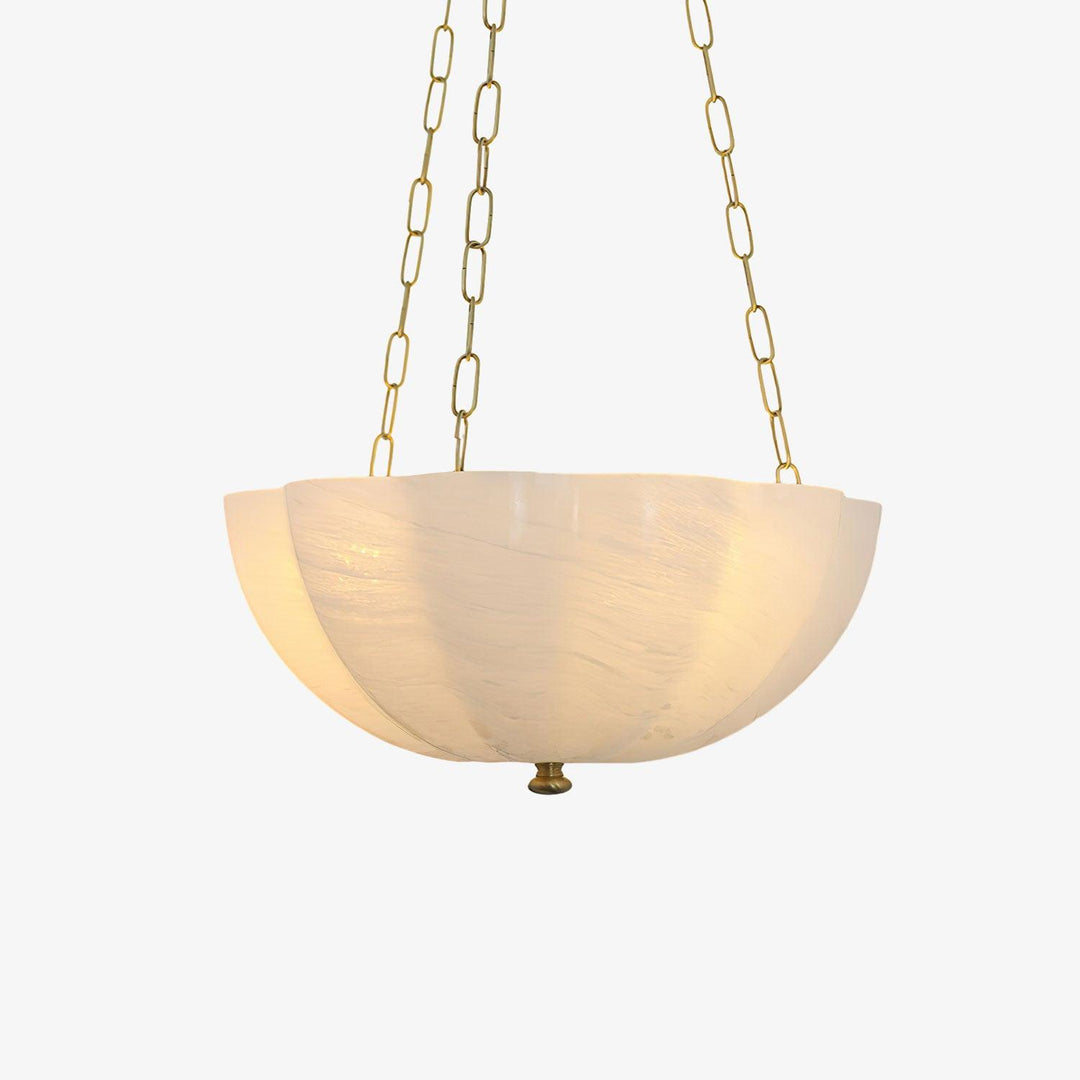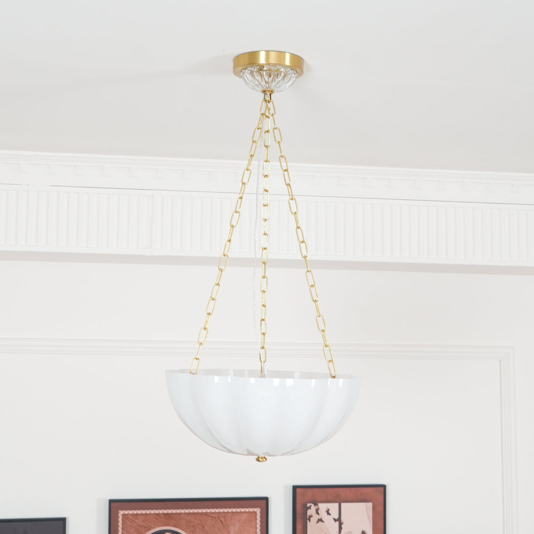 With hints of art deco, the traditional charm of the Rosehill Chandelier can be seen throughout. Known for her blending of old-world charm and modern sensibility, the chandelier is comprised of iron fixtures, chain link, and canopy, along with a flowing glass shade that hangs from it. Light diffuses through the glass in an ambient cast while the remainder bounces off the ceiling above.