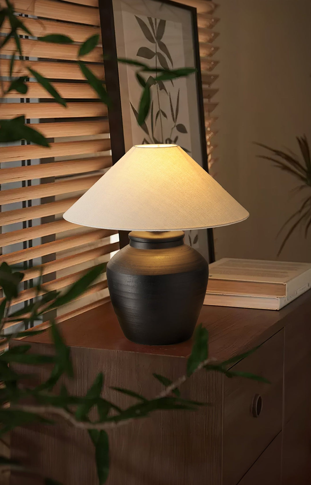 The rustic black ceramic lamp features a smooth, matte finish, making it a versatile addition to a variety of home styles. The light, natural lampshade contrasts beautifully with the dark base, offering an understated elegance.