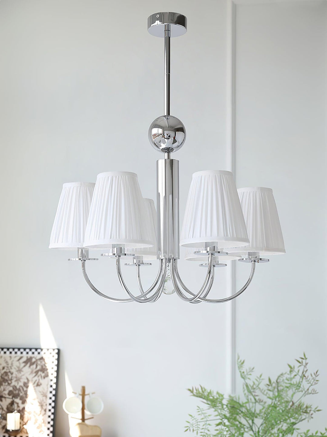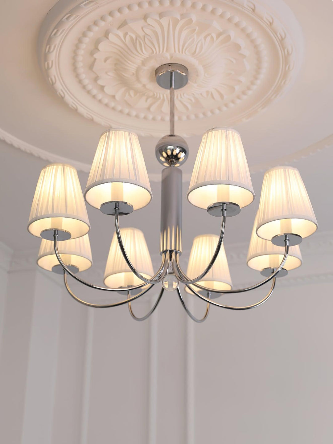 This ceiling fitting is a beautifully crafted, candelabra style chandelier. Elaborate curved hoops finished in chrome spill out from the decorative central column, which incorporates a pretty faceted glass ball. With a finish in chrome, this delightful ceiling light comes complete with white pleated cotton shades.