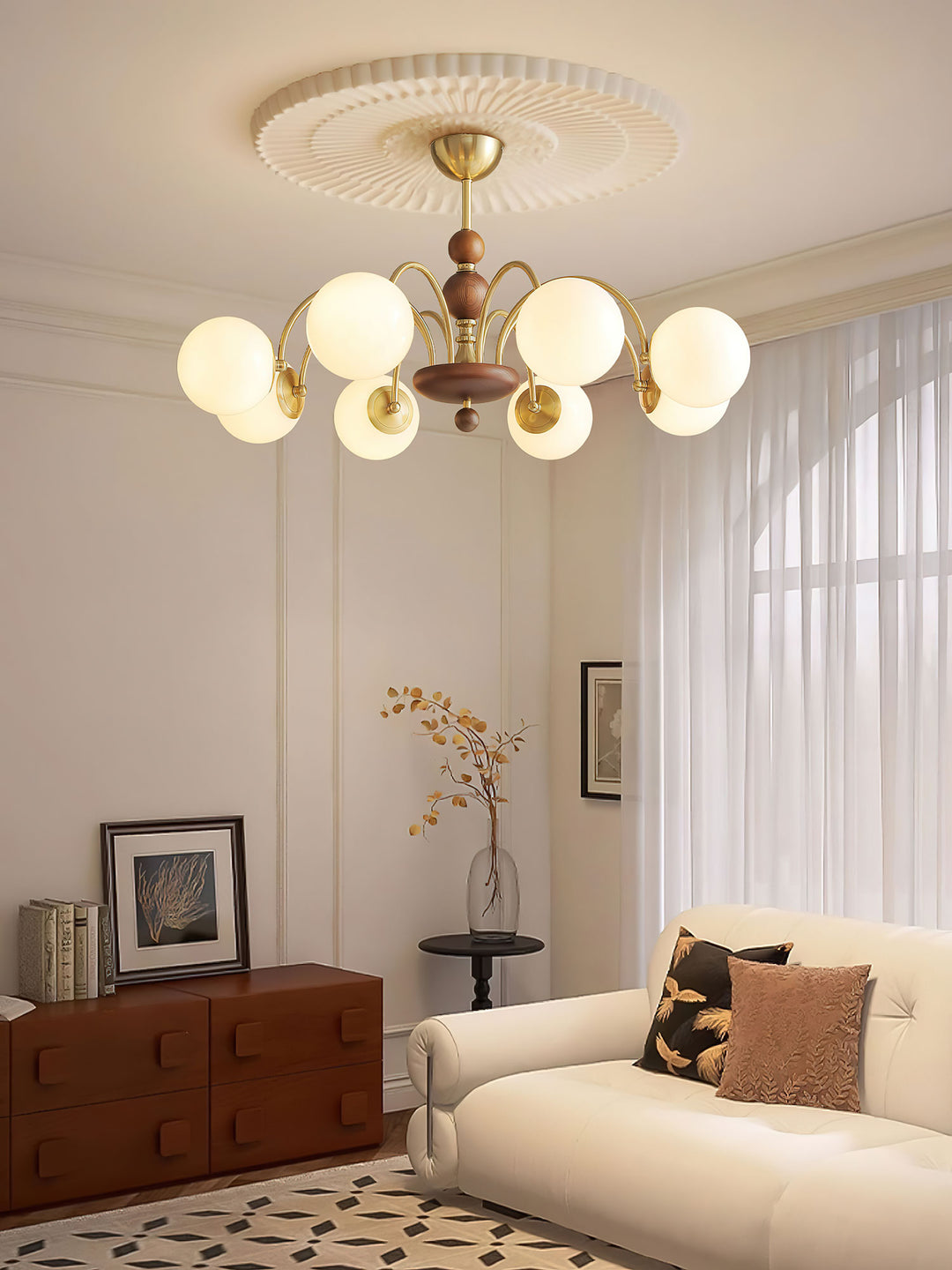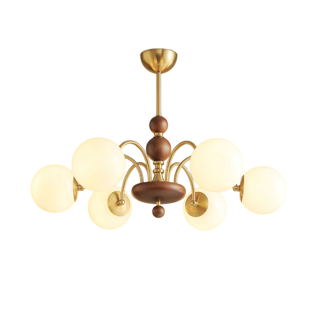 The Solara Globe Chandelier blends mid-century charm with a soft, organic aesthetic. Featuring a central wooden core with brass accents, its six gracefully arched arms extend outward, each holding a frosted glass globe that diffuses a warm, ambient glow. The interplay of walnut wood, golden metal, and matte opal glass creates a harmonious balance of material and form.