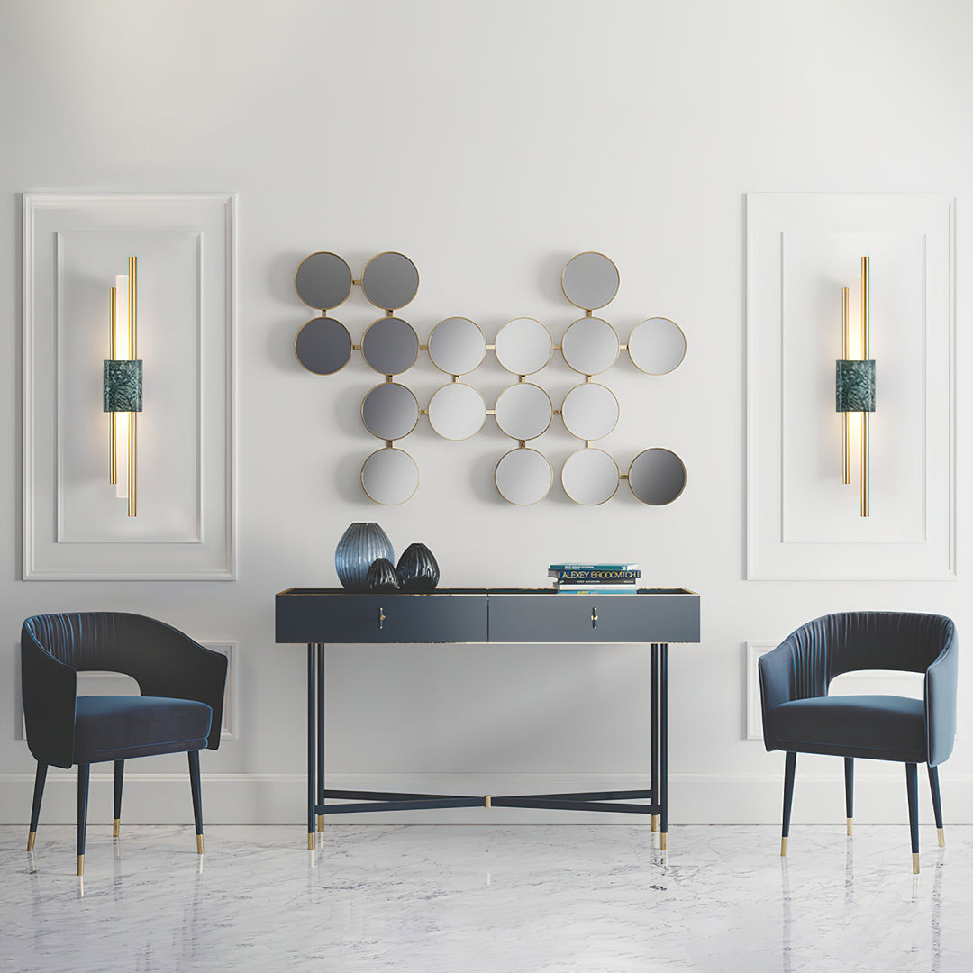 Slimline yet dynamic, the Tanto Wall Light combines two asymmetric brass rods and a central cylindrical opal lamp. Connected together by a marble front it makes quite the stylish statement on any wall.