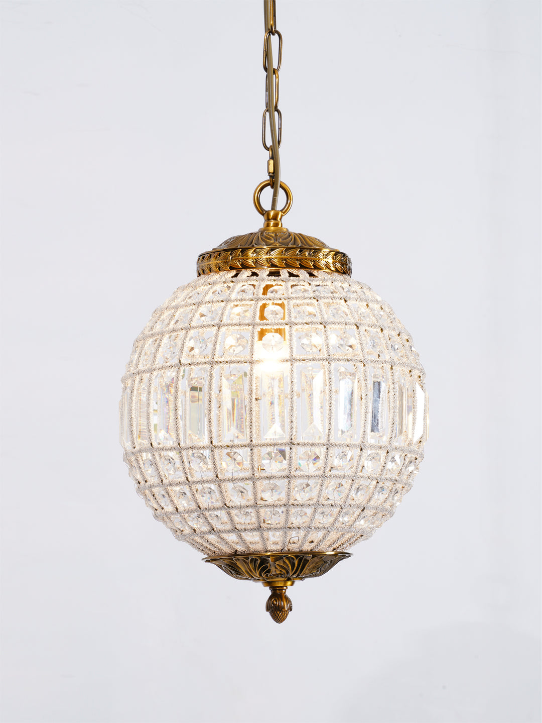 Bring brilliant style to your dining room, bedroom, or entryway with this glam single-light pendant. We love hanging this piece on its own or in multiples for a more dramatic look. It’s made of metal in a gold-tone and features an adjustable chain and an ornate header with a matching bottom finial. The globe shade features a cage design, which is covered in rows of clear crystals, which glitter in the light.