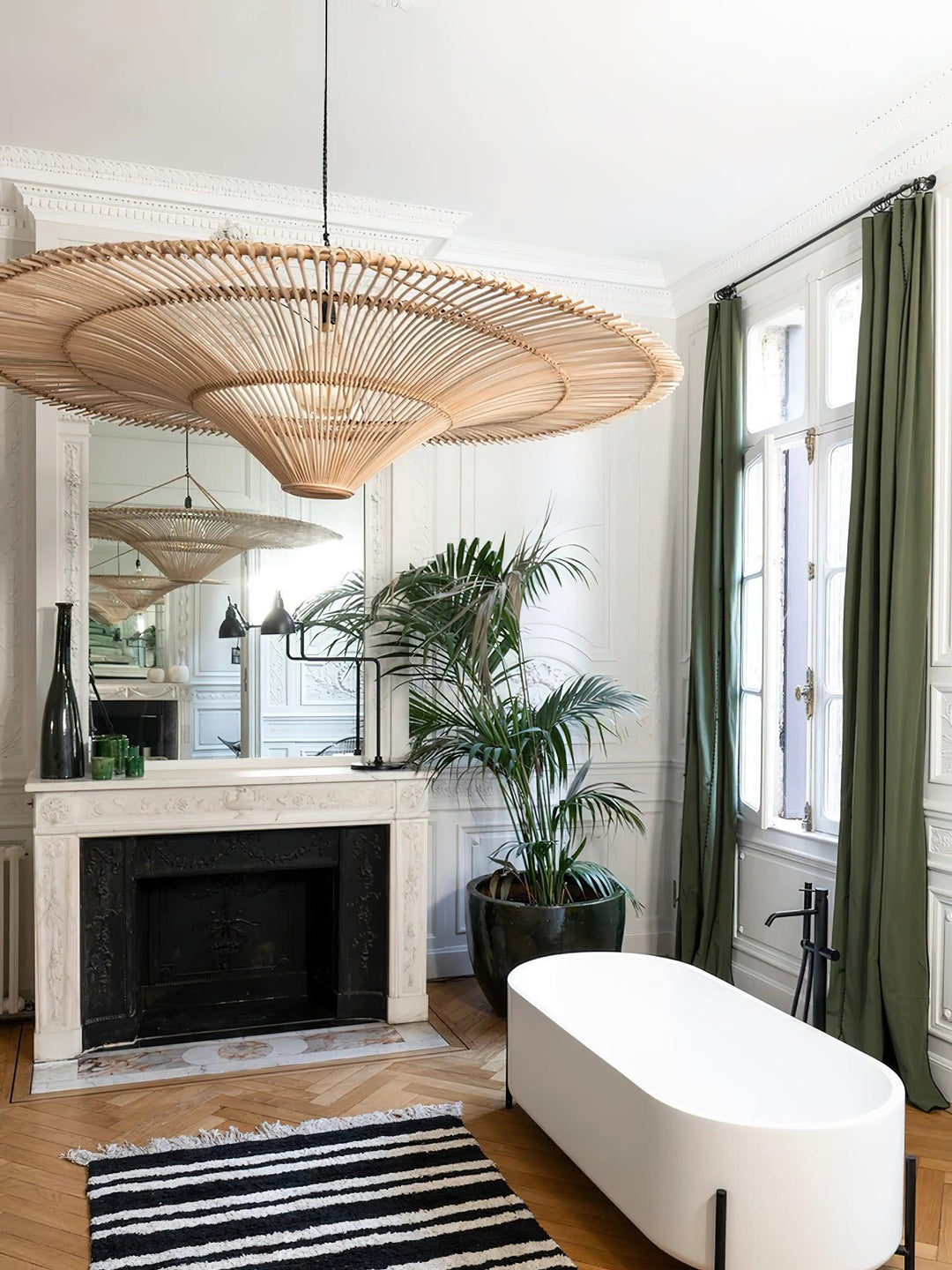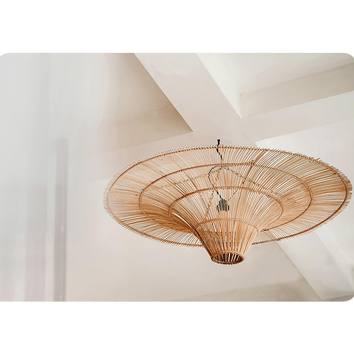 This sprawling rattan shade feels natural but makes a big statement. The irregular edging of the rattan enhances the rustic feel and the Vintage natural rattan finish adds subtle sophistication and a warm glow. Hang this one-light pendant over a dining table or in a larger living space to add a modern organic vibe.