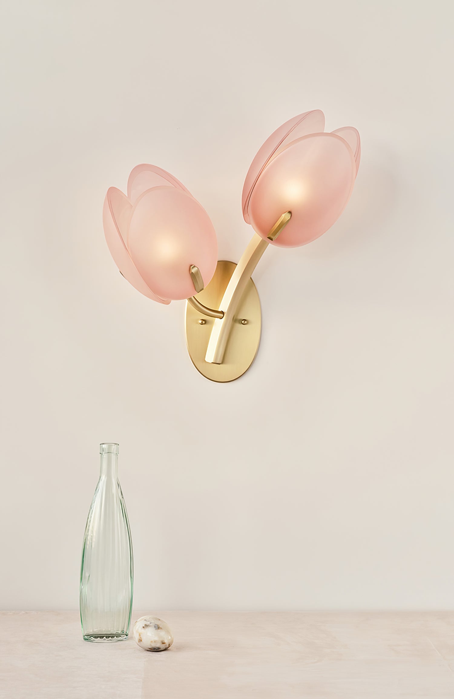 Inspired by the delicate form of tulip petals, the Tulyn Bloom Wall Light brings a sense of organic charm and softness to any room. Crafted with frosted blush-pink glass and brushed gold stems, it’s a poetic combination of elegance and artistry—perfect for bedrooms, powder rooms, or any romantic nook.