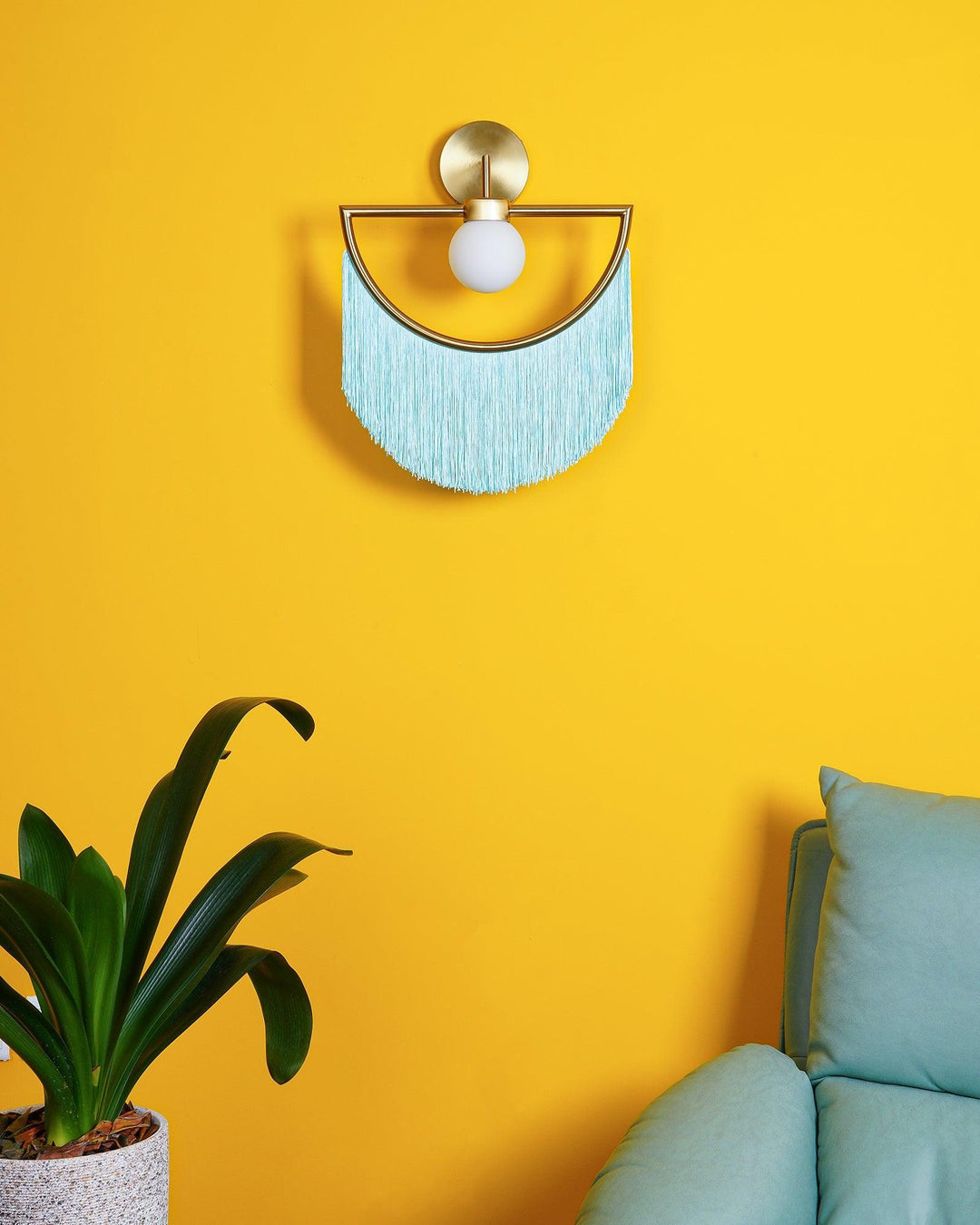 The Wink Tassel Cute Wall Lamp is a charming piece of retro-modern inspiration. The delicate tassels in a variety of colors pay tribute to boudoir themes and 30s aesthetics, creating a strikingly modern look. Decorated with graceful fabric tassels, this Bohemian-style lamp contains a gold-colored metal geometric structure for a precious gem-like finish.