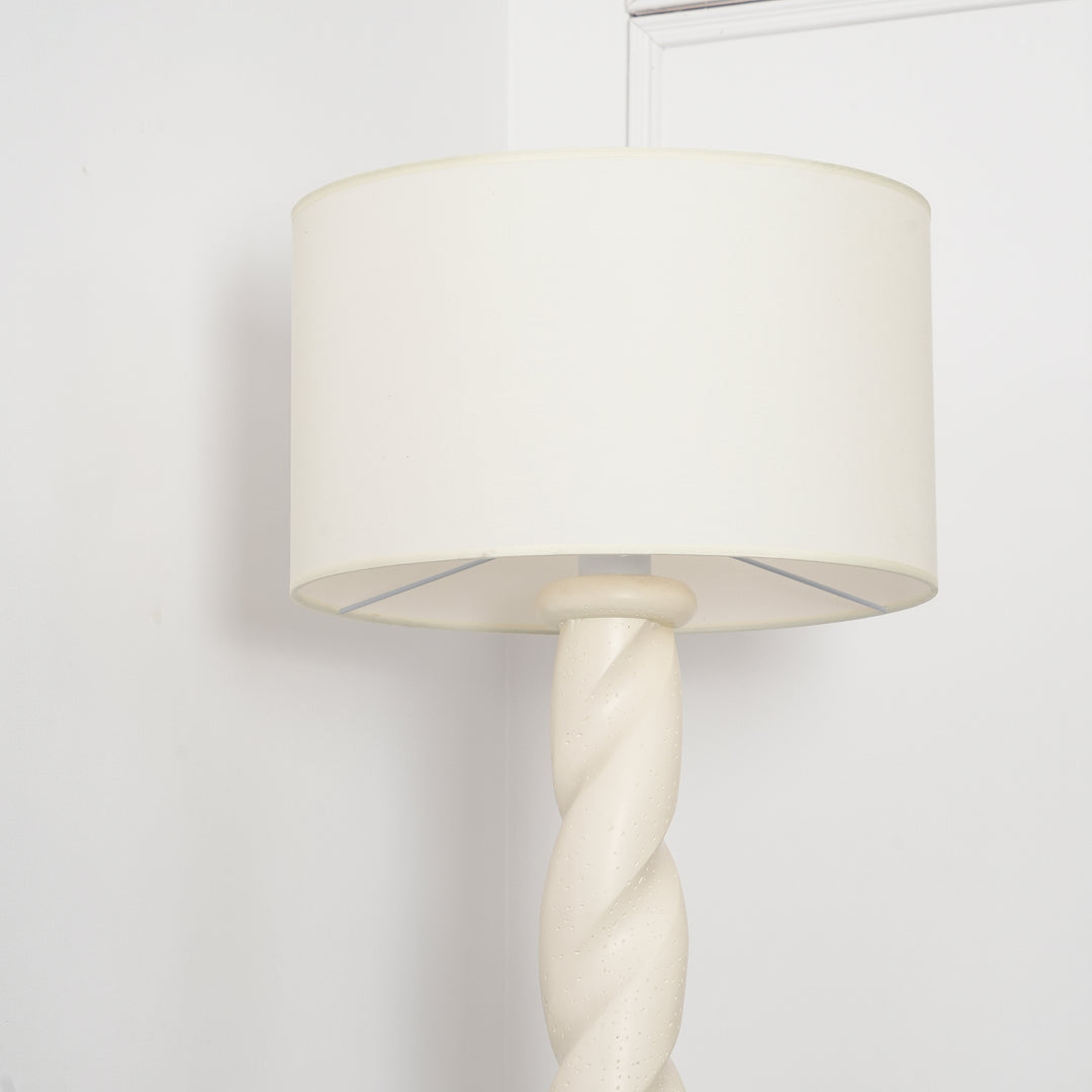 Light up your space with elegant whimsy when you display this twist-base floor lamp. Featuring a round base and twisting resin neck, topped with a woven drum shade. Plugs in to power on; compact fluorescent compatible.